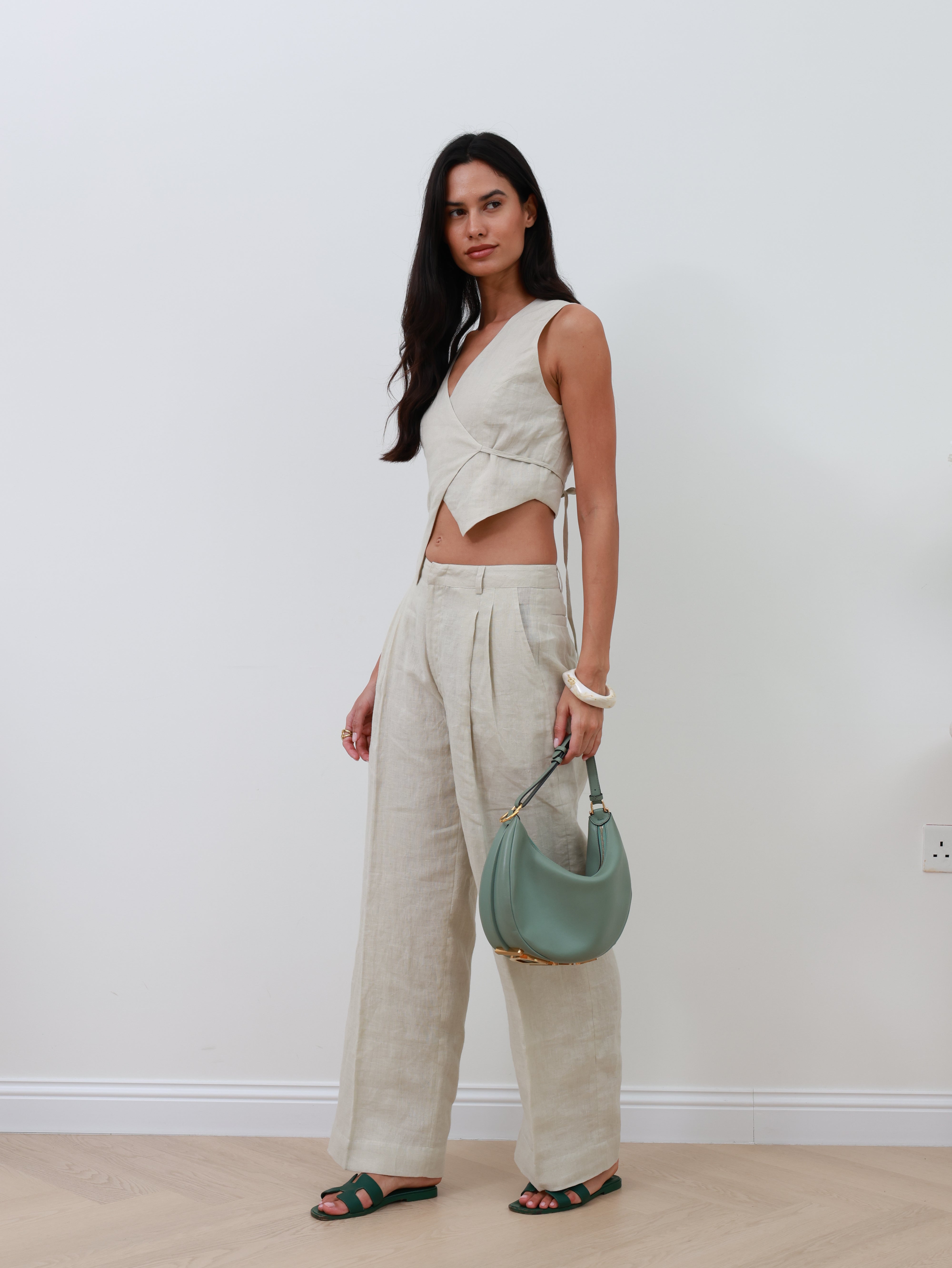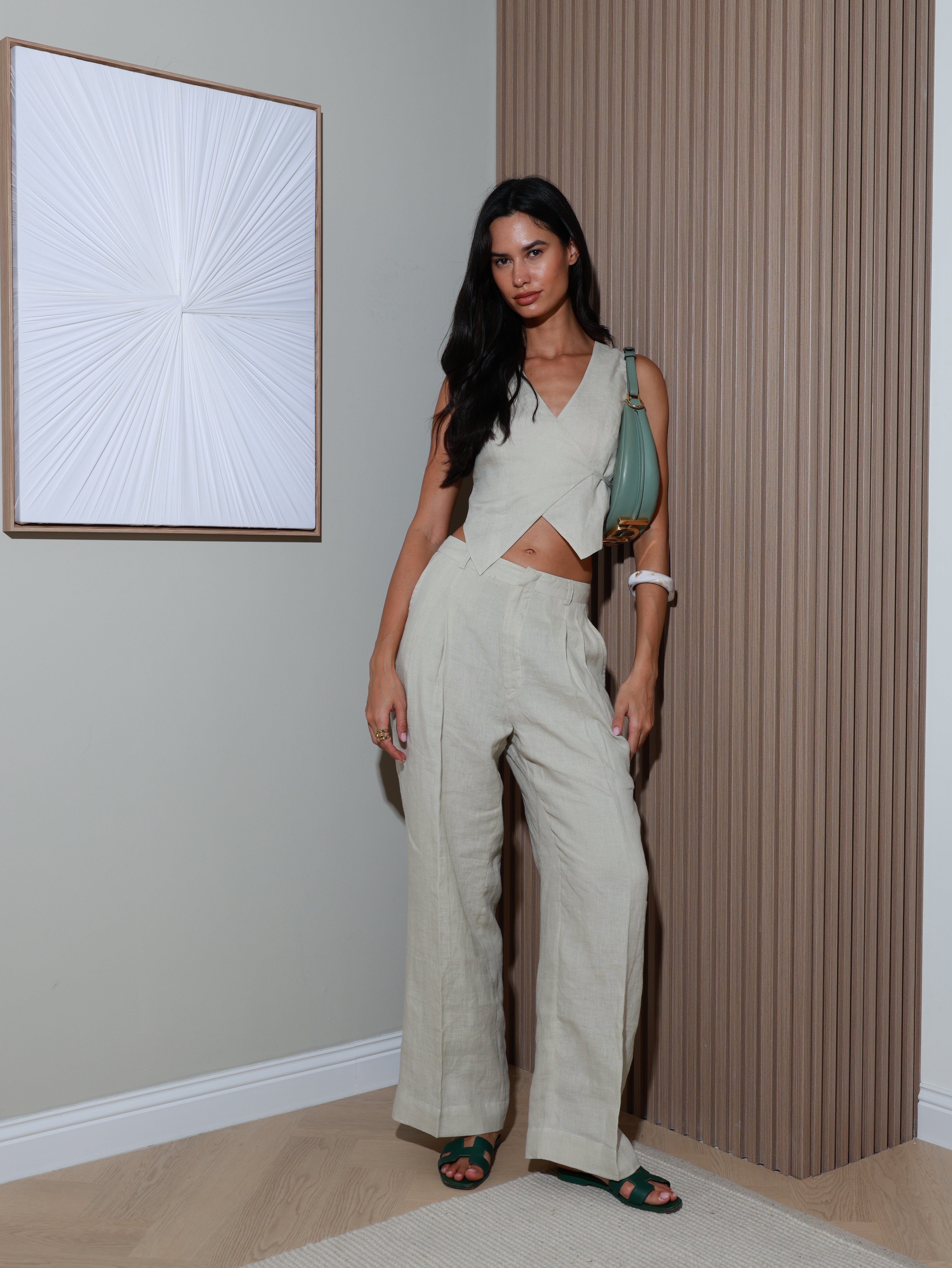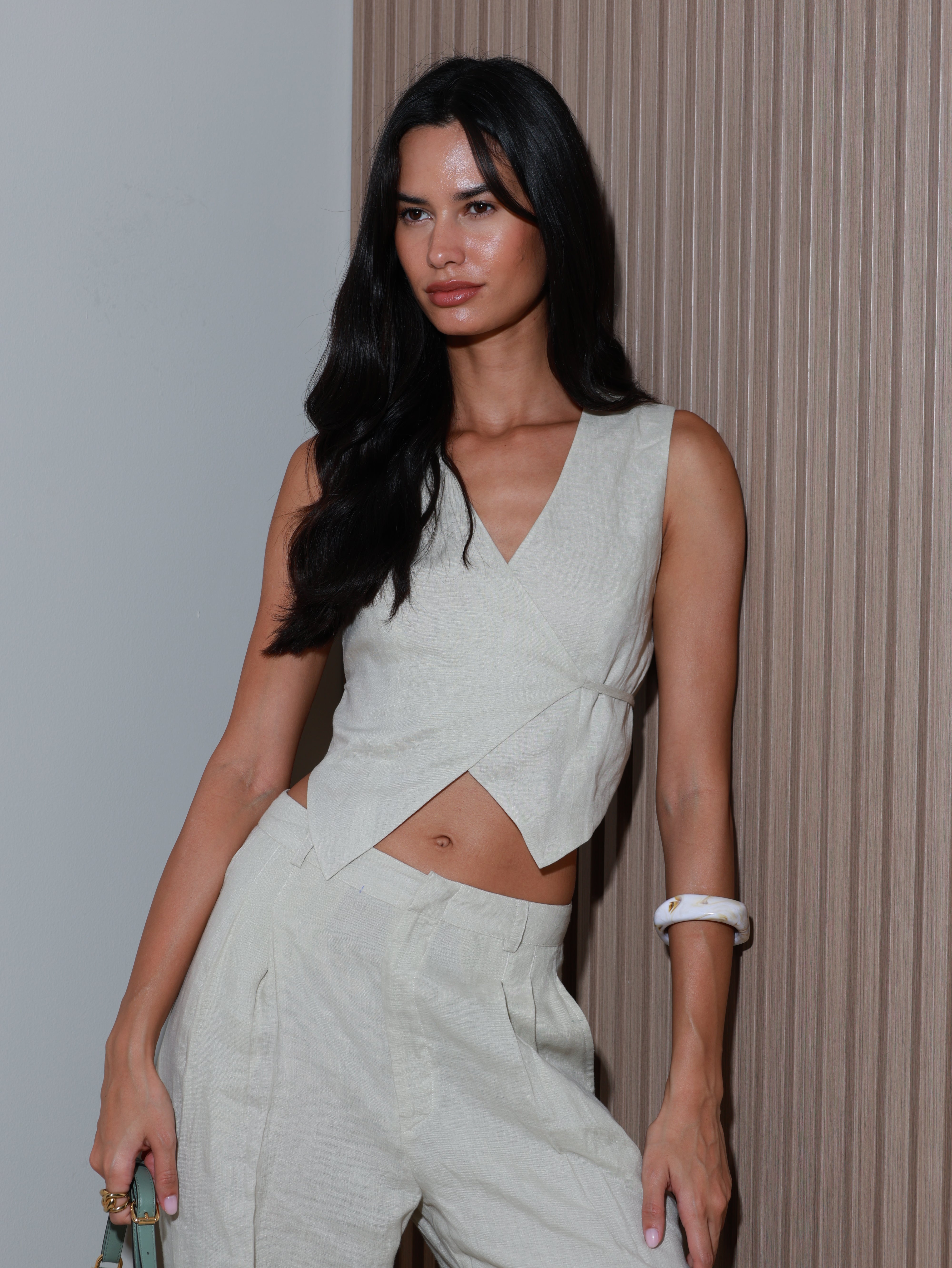 Crafted from 100% linen and fully lined in cotton mulmul, the pieces feel breathable, soft, and elevated—ideal for both warm-weather days and polished evenings. Designed in a Small (S) fit, the vest measures 21” while the pants measure 42”, creating an elongated and refined silhouette.