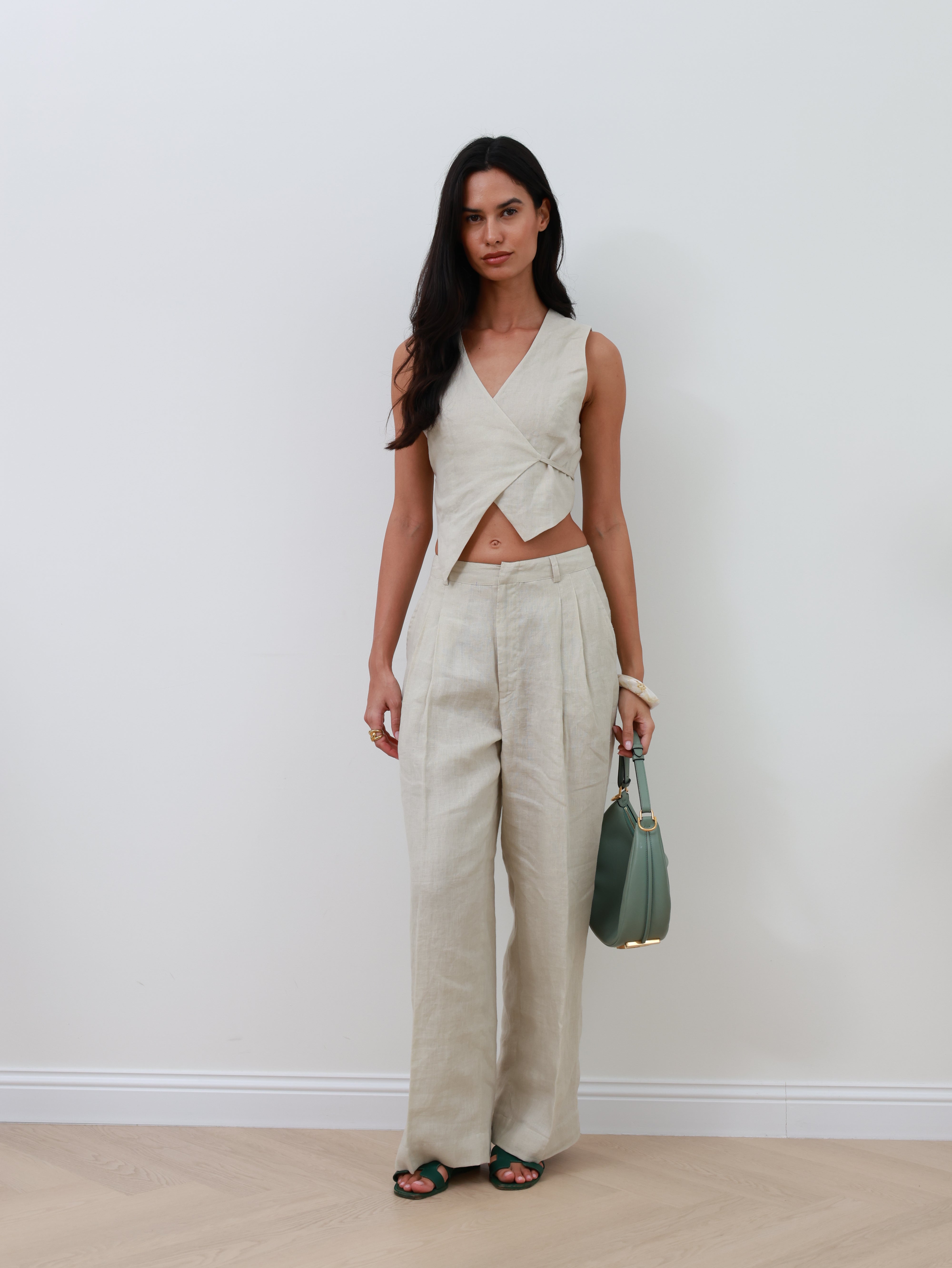 Sharp yet effortless, this co-ord set combines a tailored asymmetrical vest with relaxed wide-leg pants for a look that balances modern structure with ease. The vest features an overlapping design with front-strap closures, allowing you to adjust for a sleek, customized fit. Paired with wide relaxed-fit pants detailed with side and back pockets, belt loops, and a zip fly with hook-and-eye closure, this set brings together practicality and understated sophistication.