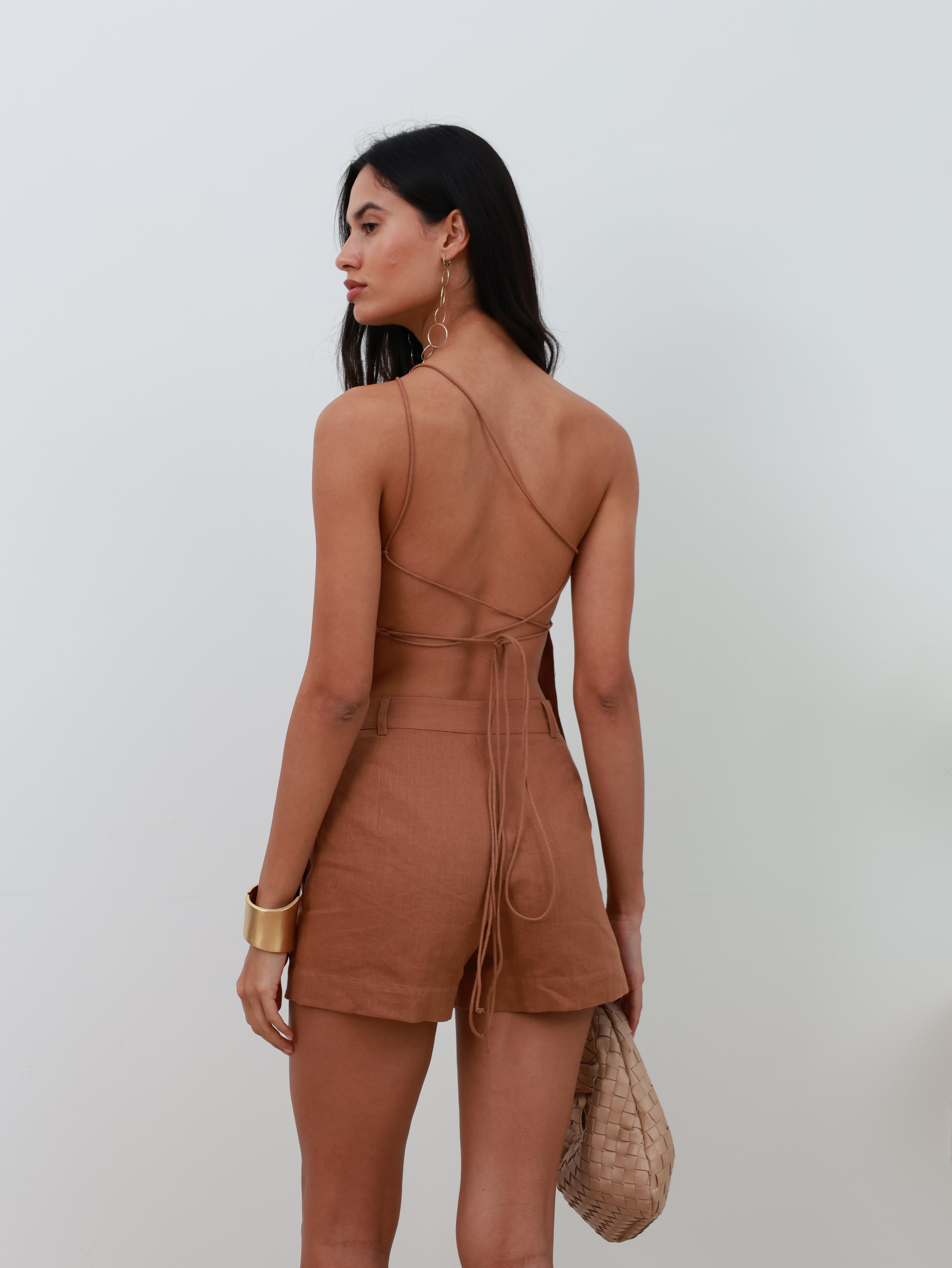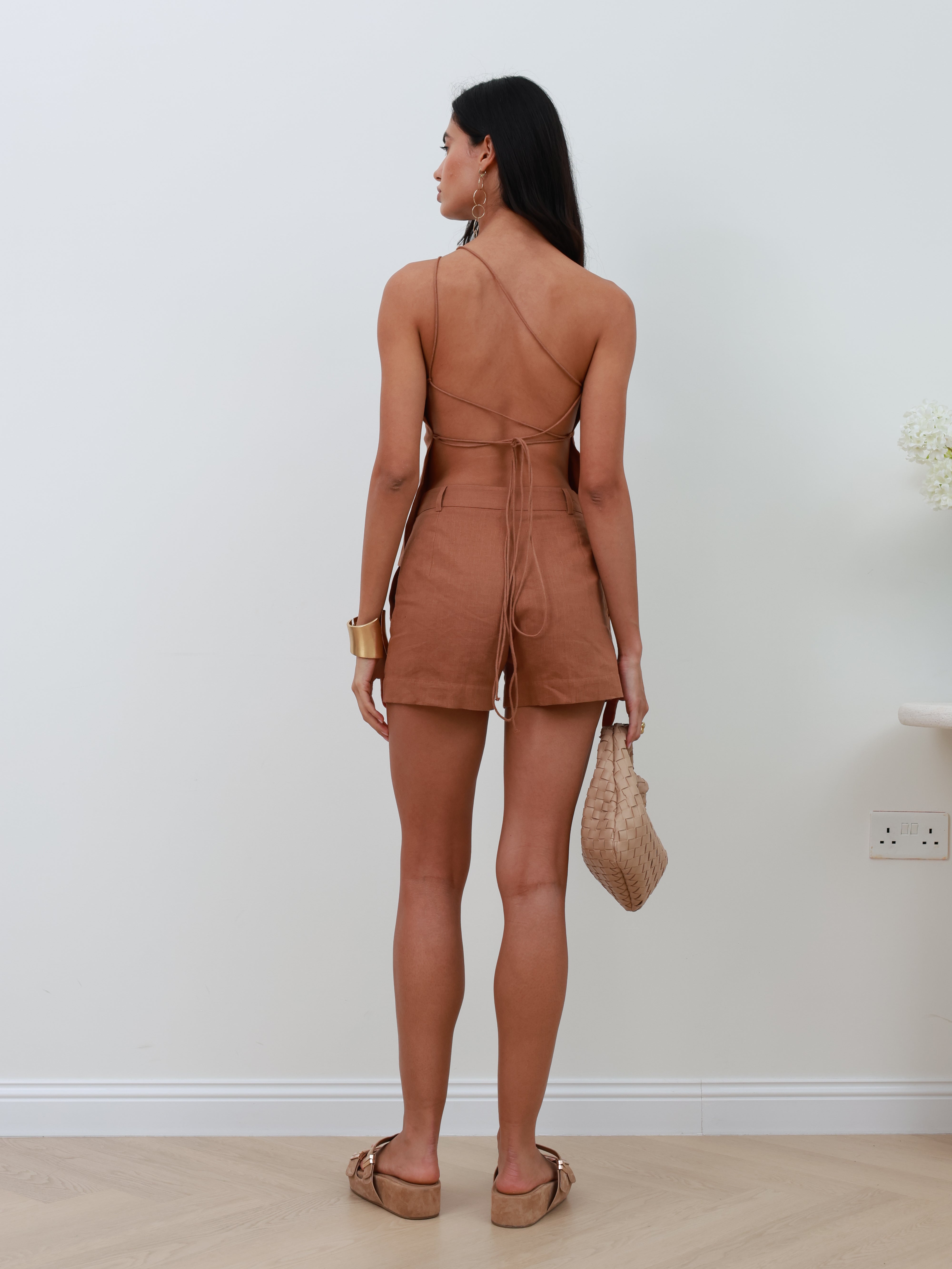 Minimal, modern, and versatile — this co-ord set balances structure with ease. The asymmetrical top features a distinctive cut with cross-criss straps at the back, allowing for a fully customizable fit. Paired with tailored mini shorts detailed with front side pockets, belt loops, and a hook-and-eye/zipper closure, the set offers both function and clean, refined design.