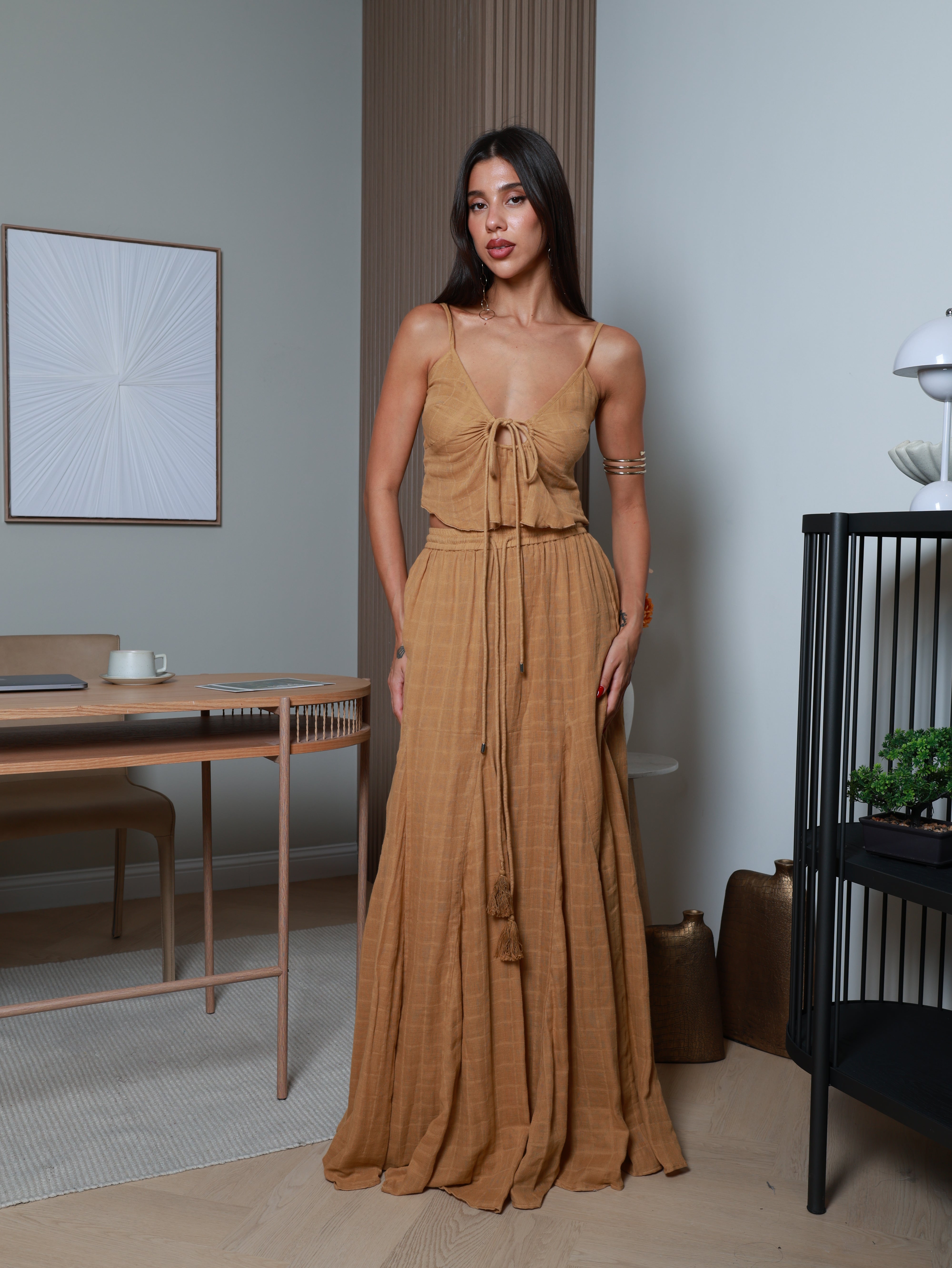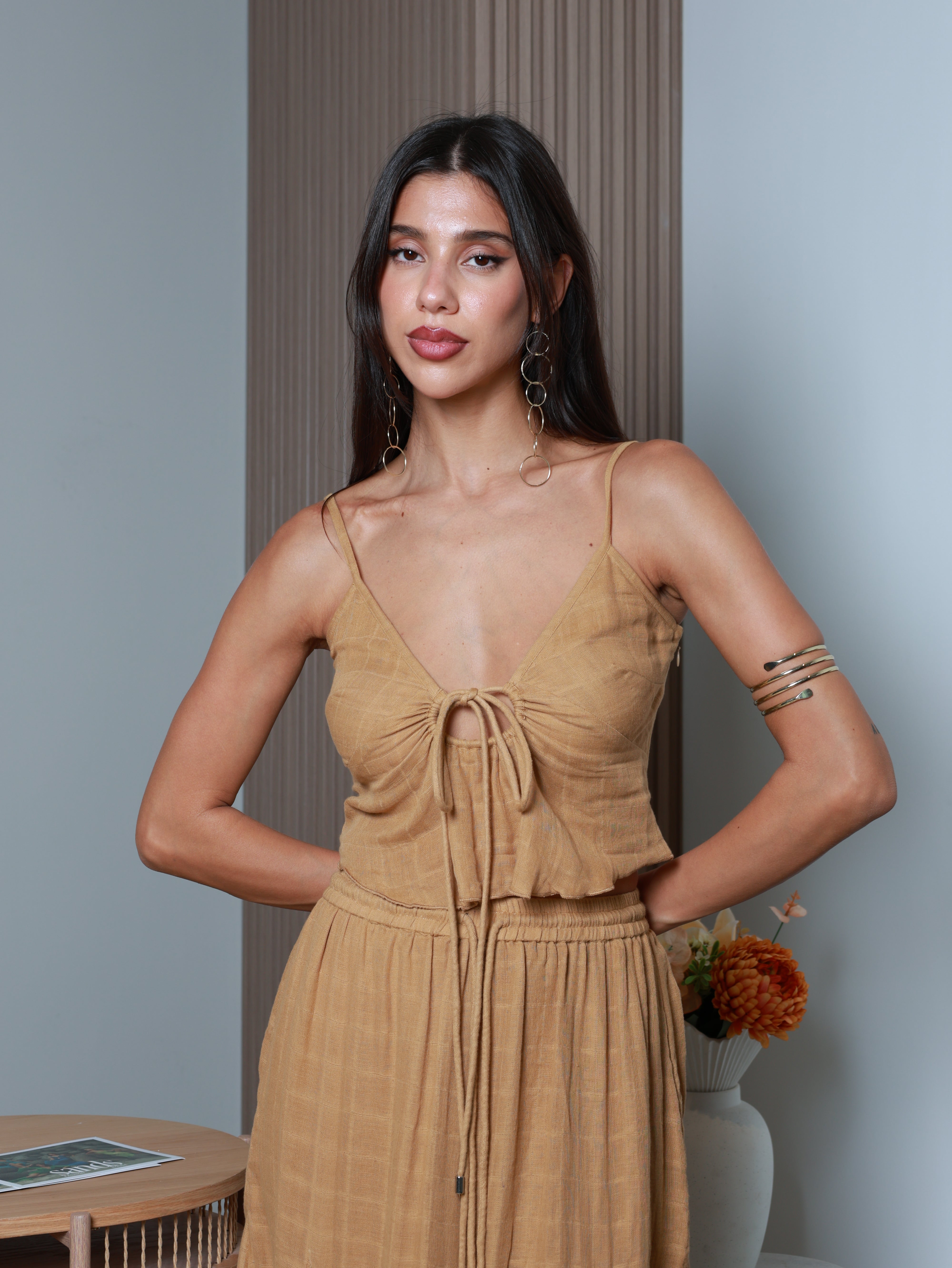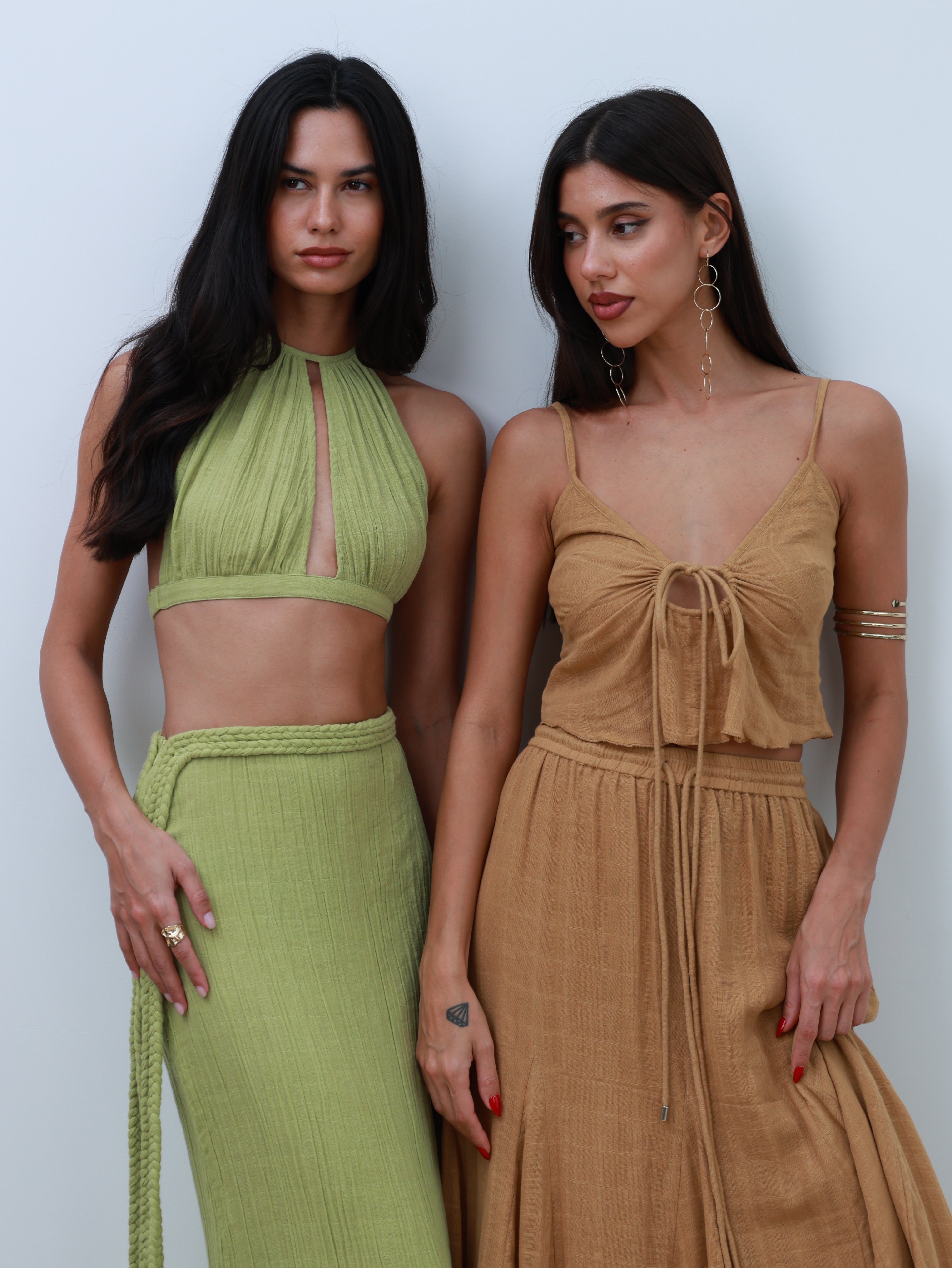 Crafted from plain gauze with a soft cotton base, the fabric is lightweight, breathable, and ideal for warm-weather styling. Cut to a shorter length, this versatile piece pairs effortlessly with high-rise skirts, tailored pants, or casual denim.