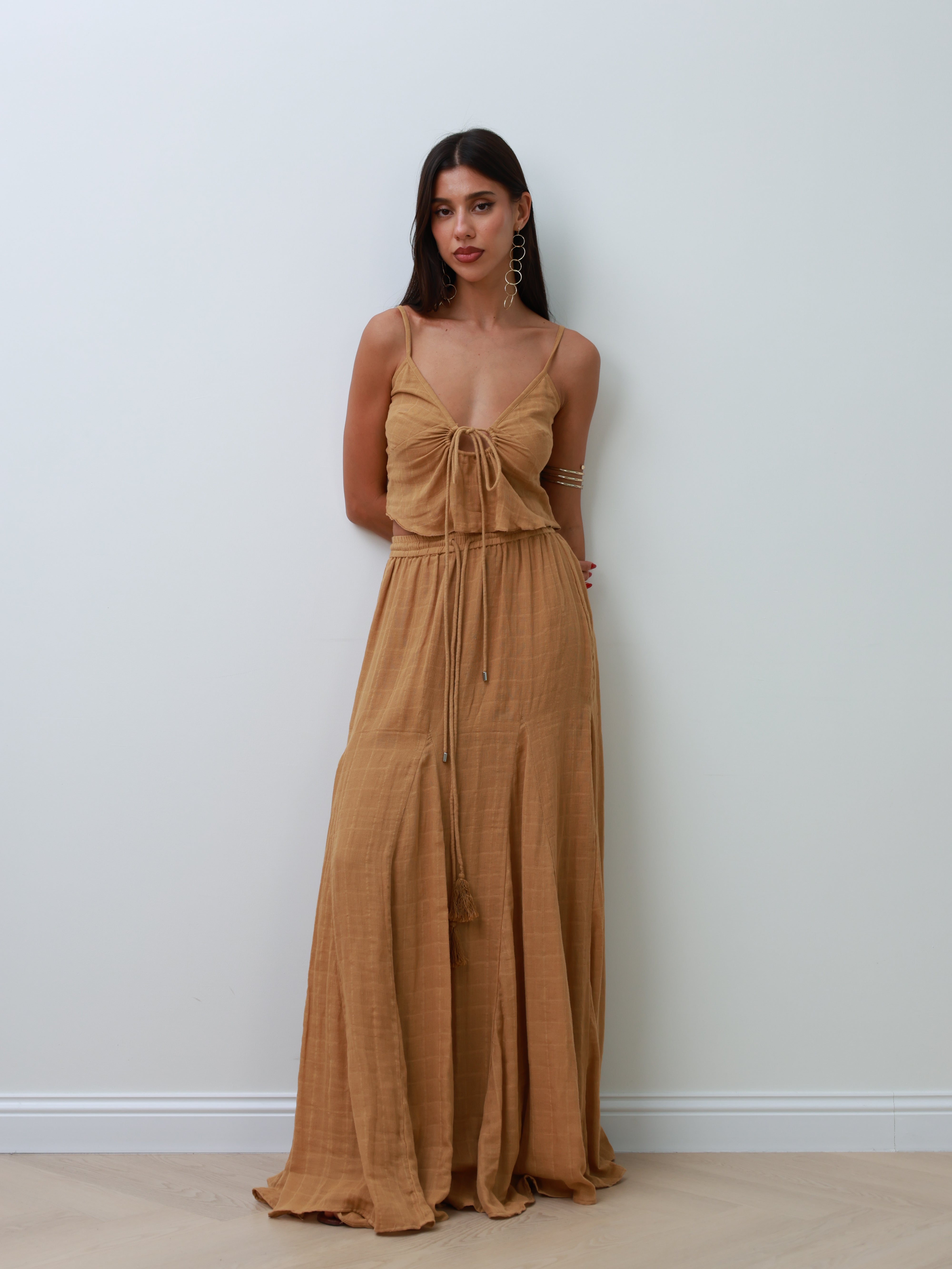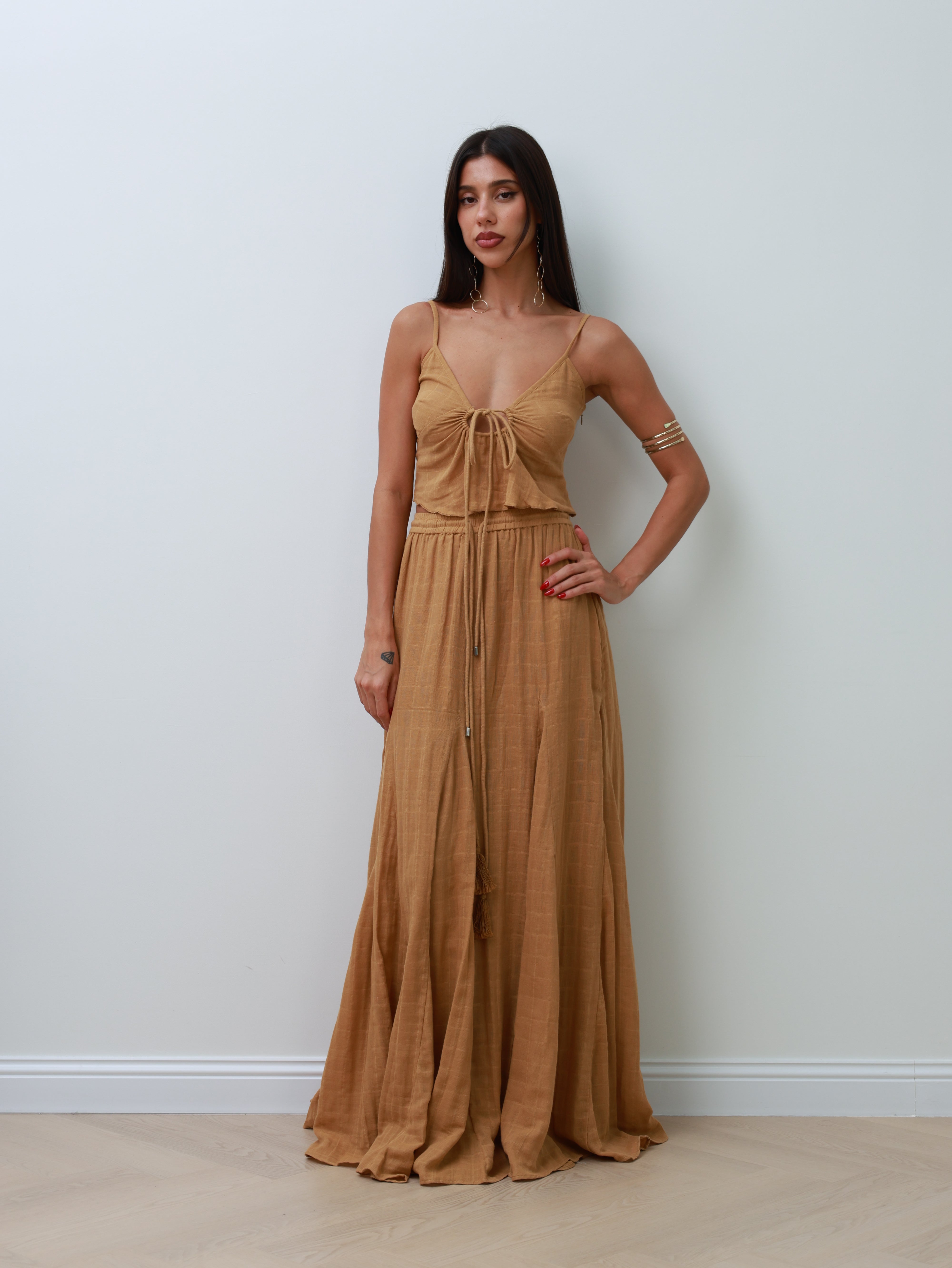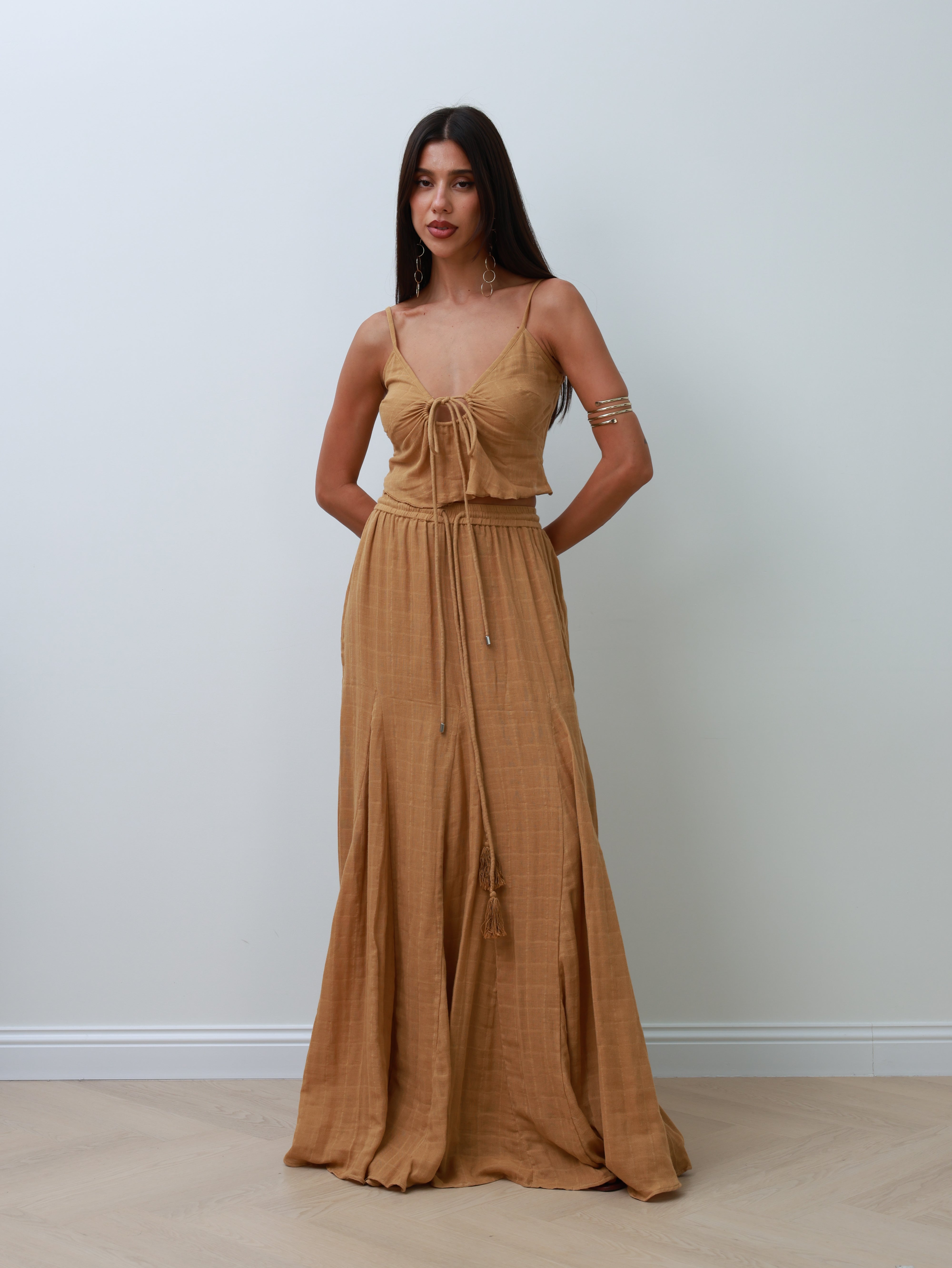 Crafted from plain gauze with a soft cotton base, the fabric is lightweight, breathable, and ideal for warm-weather styling. Cut to a shorter length, this versatile piece pairs effortlessly with high-rise skirts, tailored pants, or casual denim.