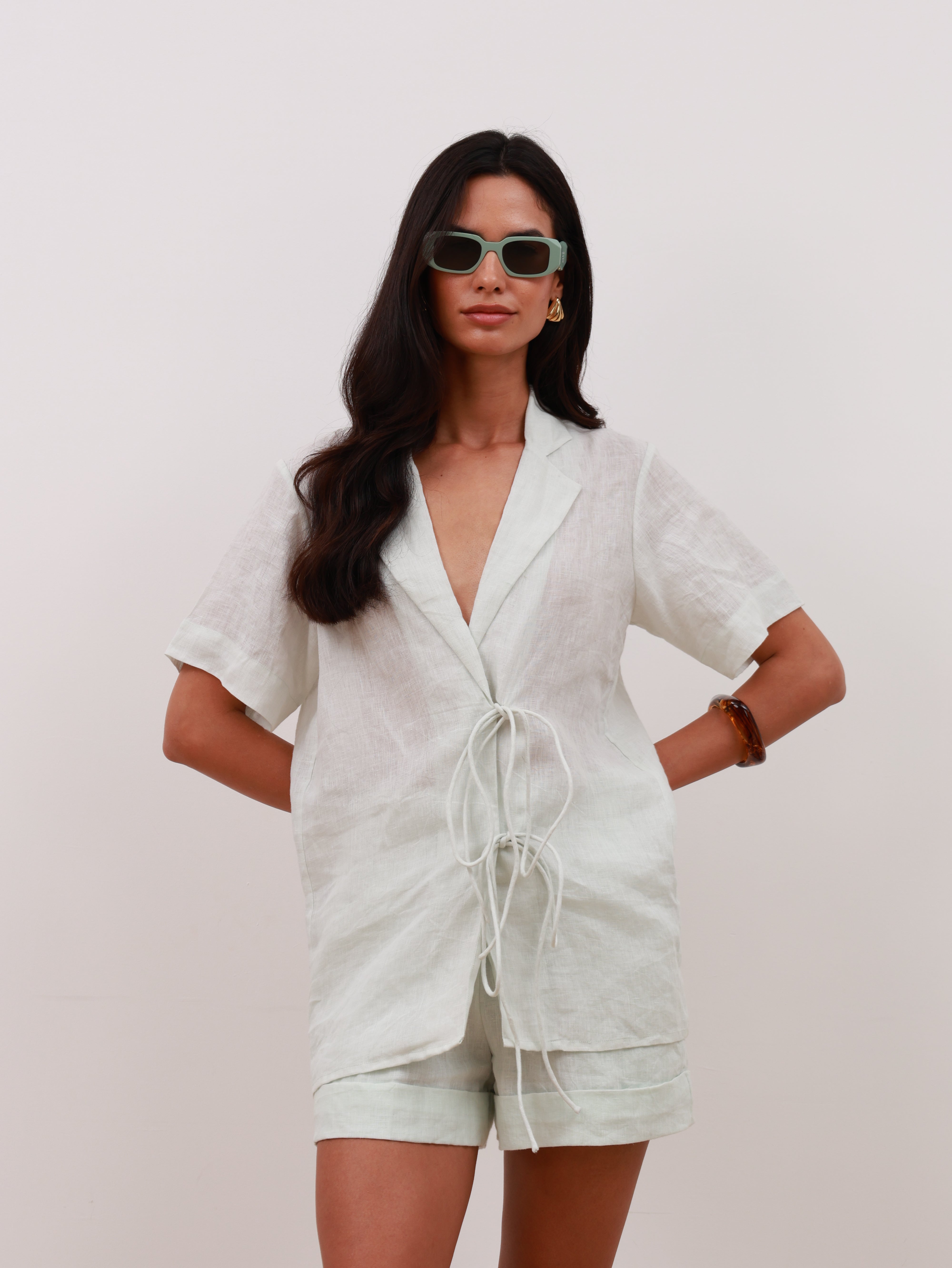 Crafted in 100% linen as the main fabric, the pieces are lightweight and airy. The shorts are fully lined with soft cotton mulmul for comfort and coverage, while the shirt remains unlined for an effortlessly fluid drape. Designed in a Small (S) fit, the shirt measures 28” and the shorts measure 16”, making the set versatile for both casual outings and resort moments.
