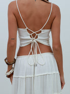 Effortlessly elegant, this sleeveless flounce top blends refined detailing with a modern silhouette. The front is elevated with delicate pin-tuck accents, while the back features loop detailing with a drawstring tie and sleek stopper, adding a touch of understated charm with functional ease.