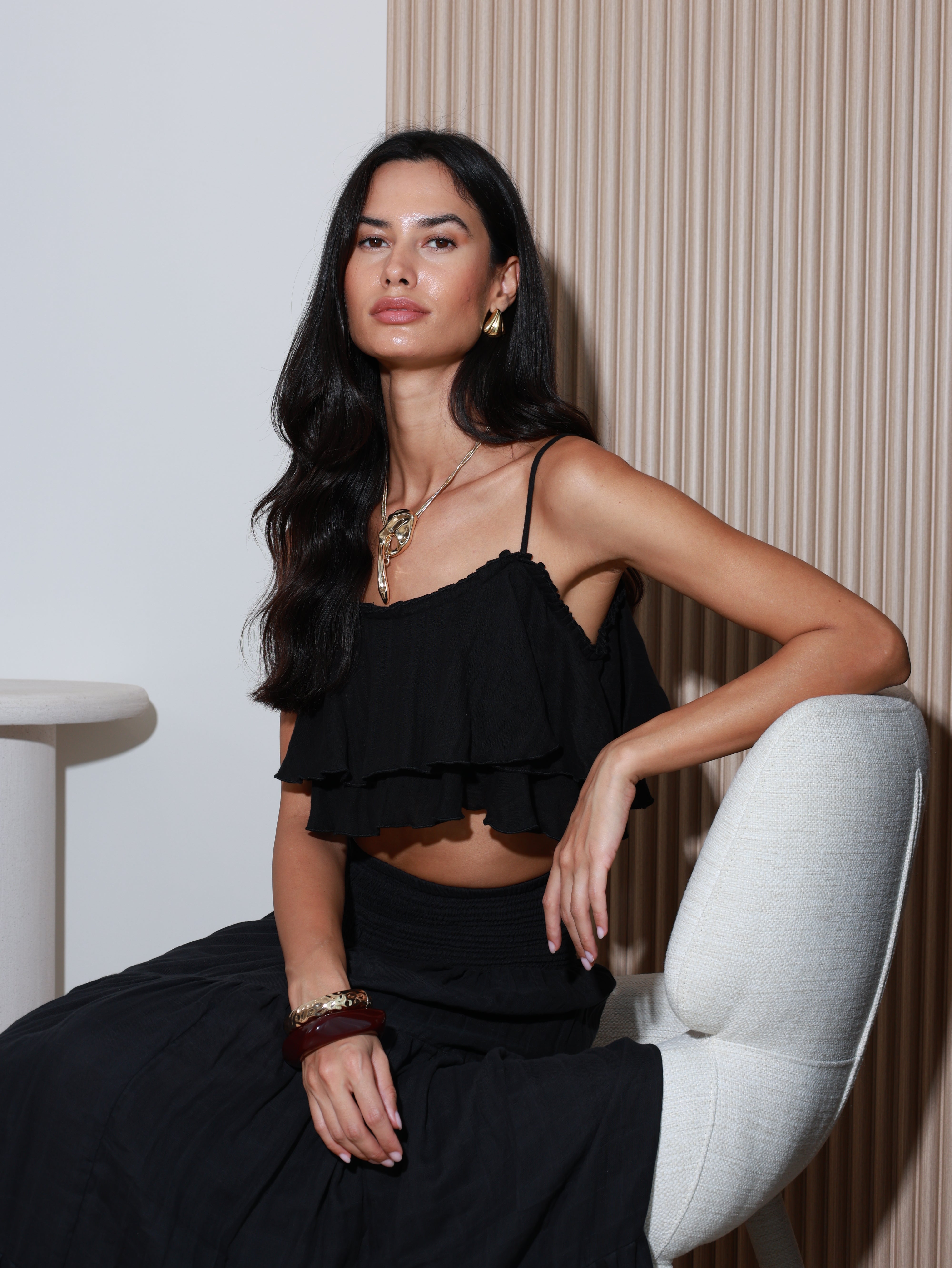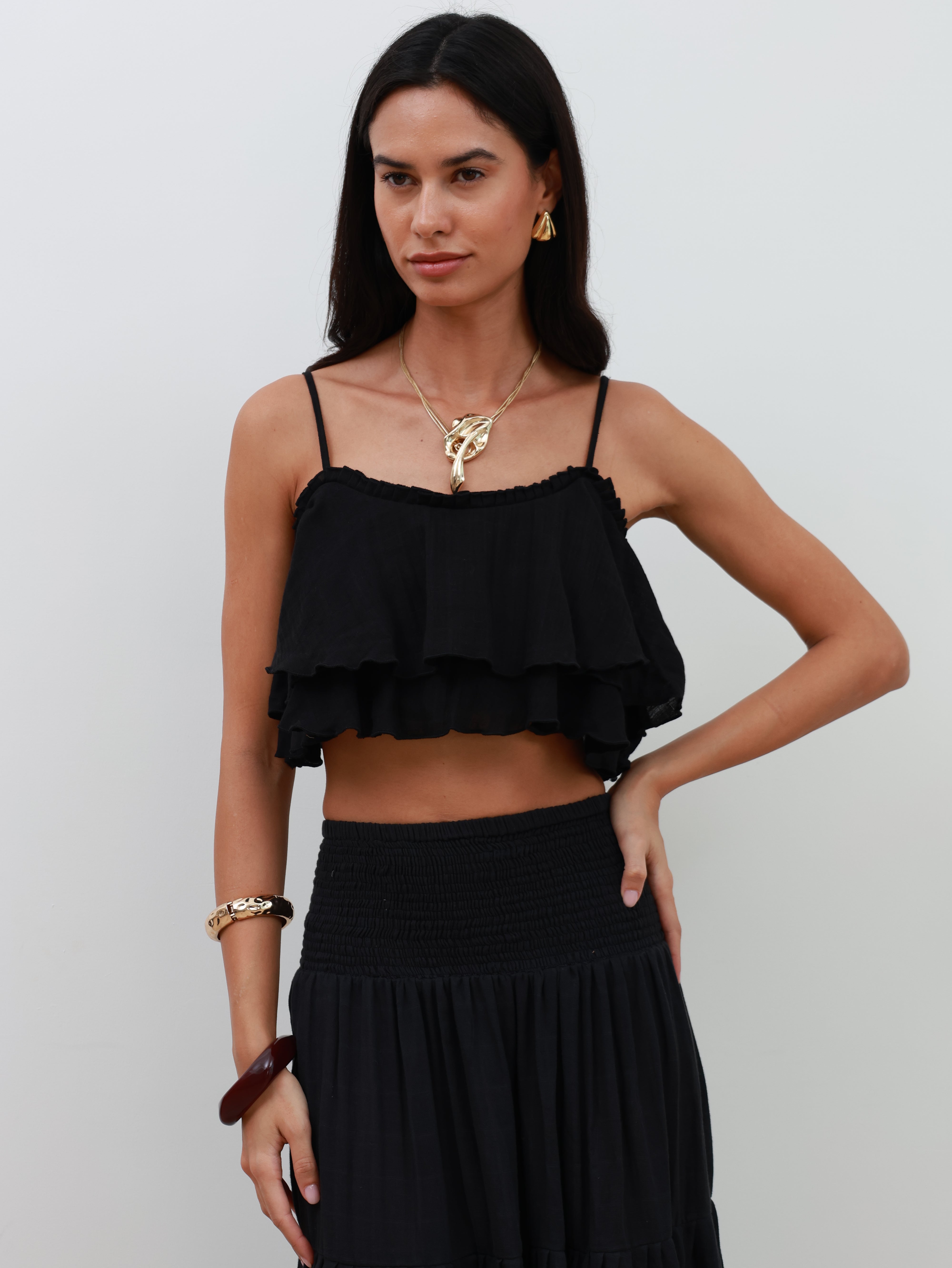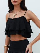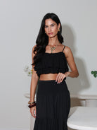 Playful yet poised, this loose flounce crop top embodies effortless sophistication. Featuring adjustable strap buckles for a personalized fit, its pleated borders along the front and back neckline add depth and a touch of feminine detail.