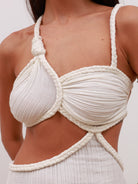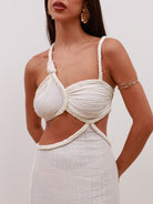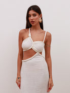 Elegant and effortless, this braided maxi dress is designed with a sleek open-back silhouette and a tie-back closure, adding adjustability and subtle detail. The braided accents bring texture and refinement, while the flowing cut creates a graceful, elongated profile.