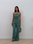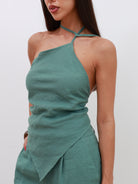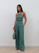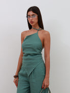 Minimal yet striking, this co-ord set pairs an asymmetrical top with a sleek wide-leg pant for a refined, contemporary silhouette. The top is designed with adjustable straps at the neck and waist, allowing for a customizable fit that flatters while maintaining ease. It is paired with wide pants featuring side and back pockets, belt loops, and a hook-and-eye with zipper closure, blending structure with functionality.