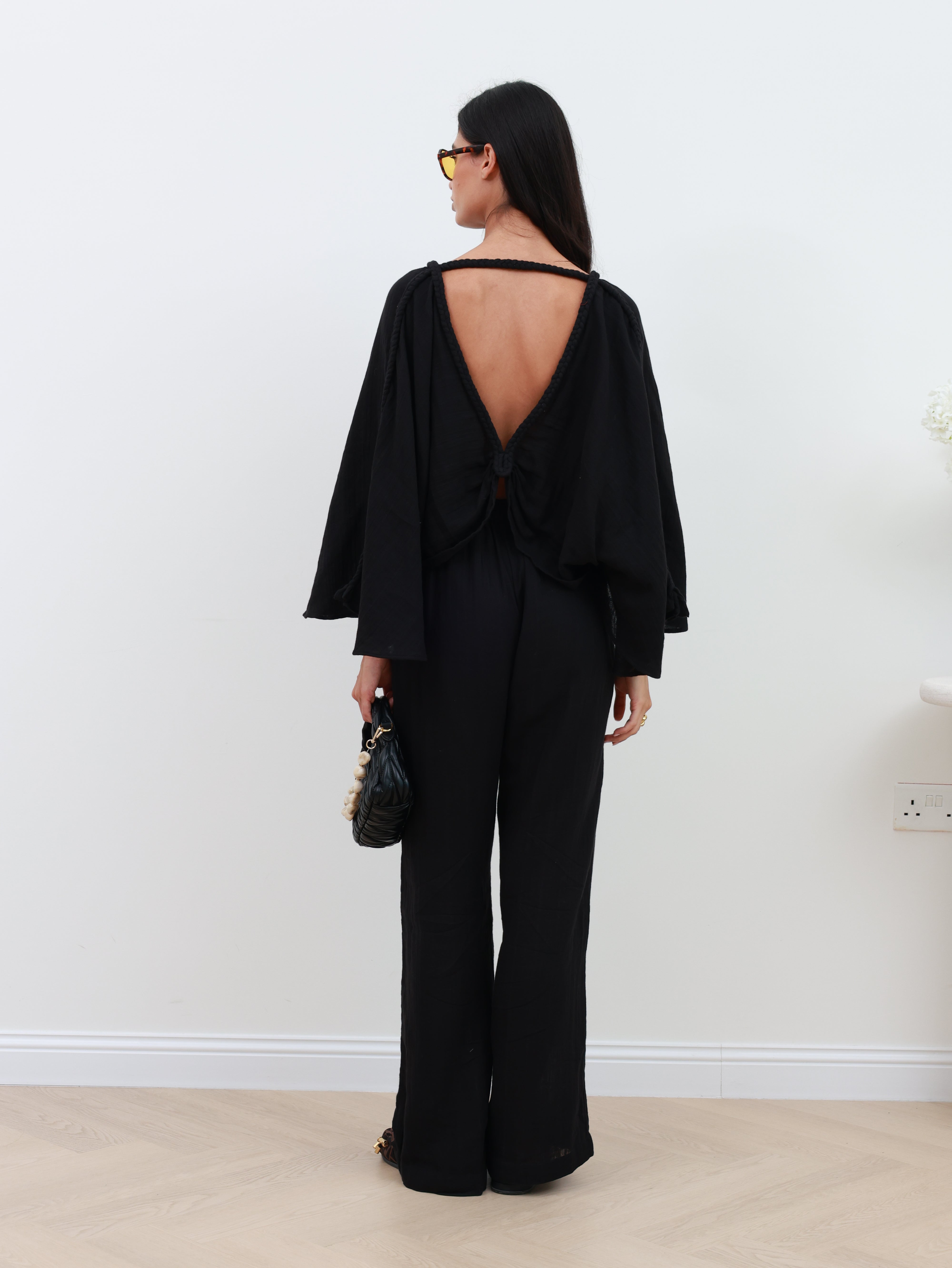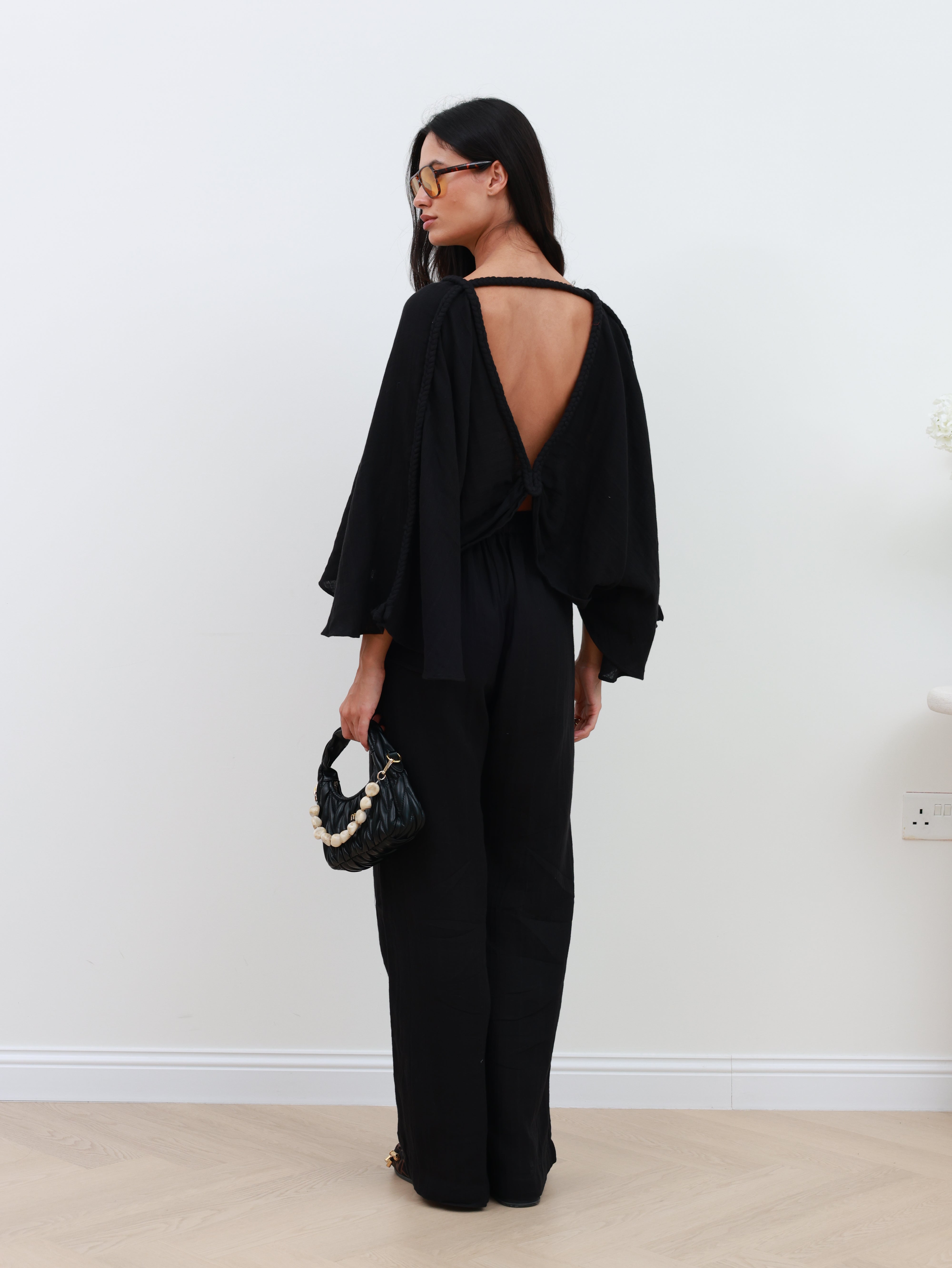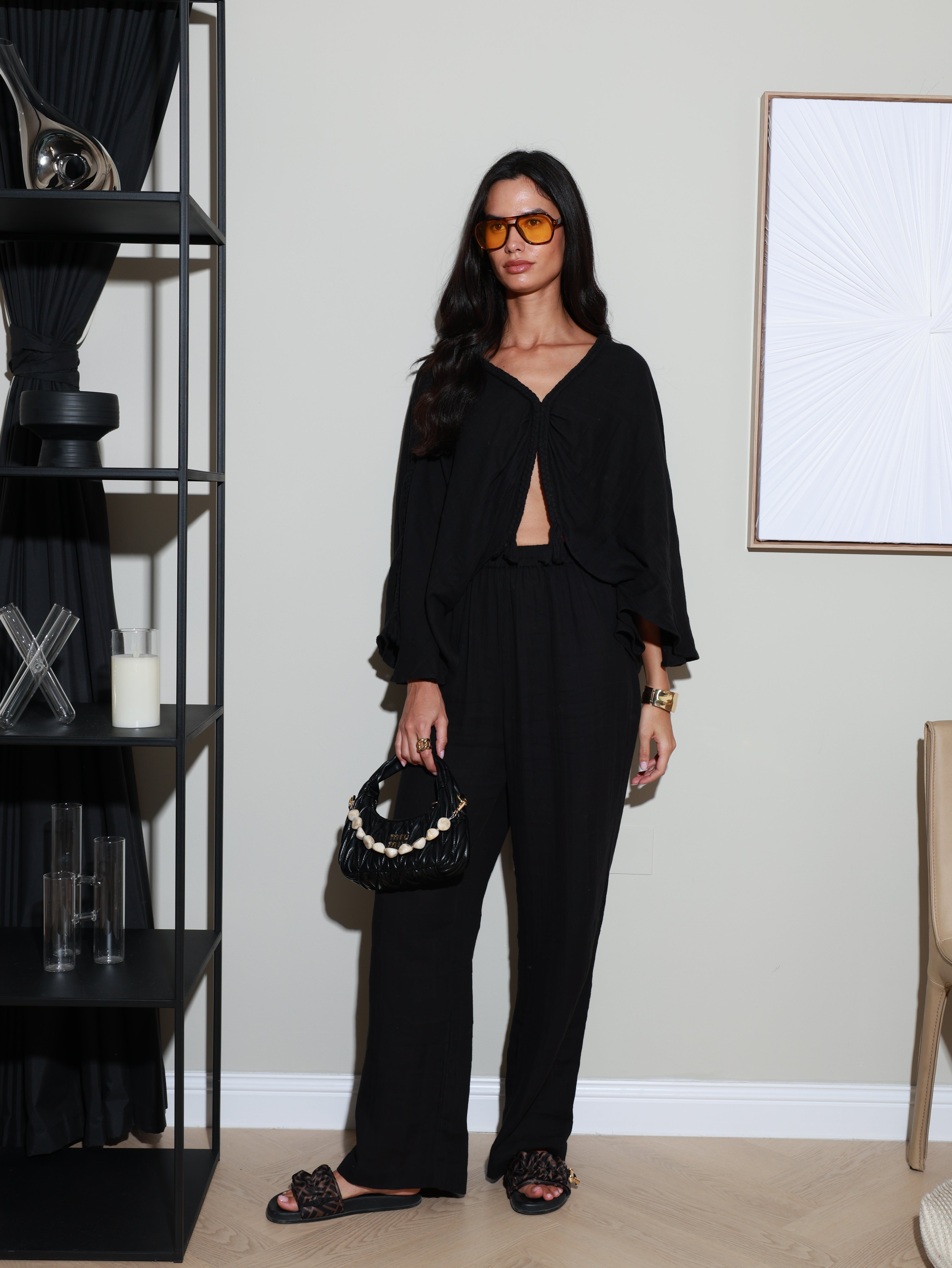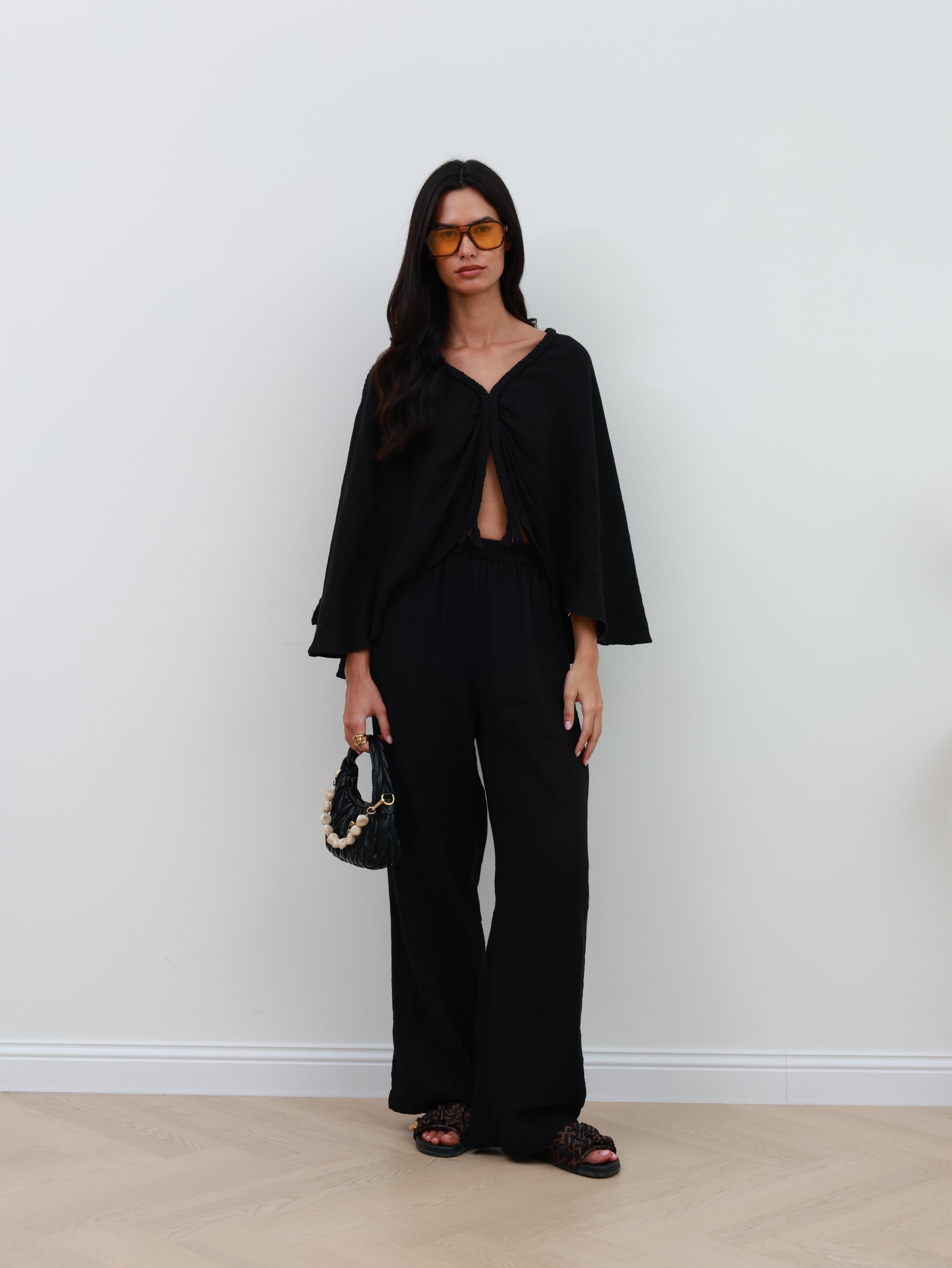 A modern yet minimal co-ord that blends ease with elegance. The cape-style top features a statement braid detail and a deep V-neckline at both front and back, creating a fluid silhouette that feels both effortless and refined. Paired with loose-fit pants designed with side pockets and an elastic waistband, this set offers comfort without compromising on sophistication.