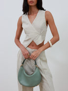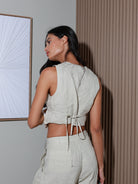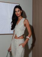 Sharp yet effortless, this co-ord set combines a tailored asymmetrical vest with relaxed wide-leg pants for a look that balances modern structure with ease. The vest features an overlapping design with front-strap closures, allowing you to adjust for a sleek, customized fit. Paired with wide relaxed-fit pants detailed with side and back pockets, belt loops, and a zip fly with hook-and-eye closure, this set brings together practicality and understated sophistication.