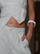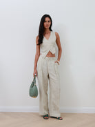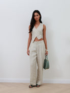 Crafted from 100% linen and fully lined in cotton mulmul, the pieces feel breathable, soft, and elevated—ideal for both warm-weather days and polished evenings. Designed in a Small (S) fit, the vest measures 21” while the pants measure 42”, creating an elongated and refined silhouette.